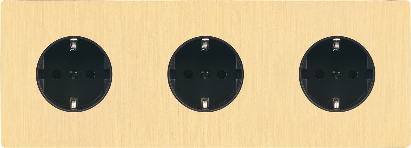 Façade "M" en laiton brossé triple horizontale, 1 prise Schuko / 1 prise Schuko / 1 prise schuko. Façade magnétique. Fabriquée en France.
