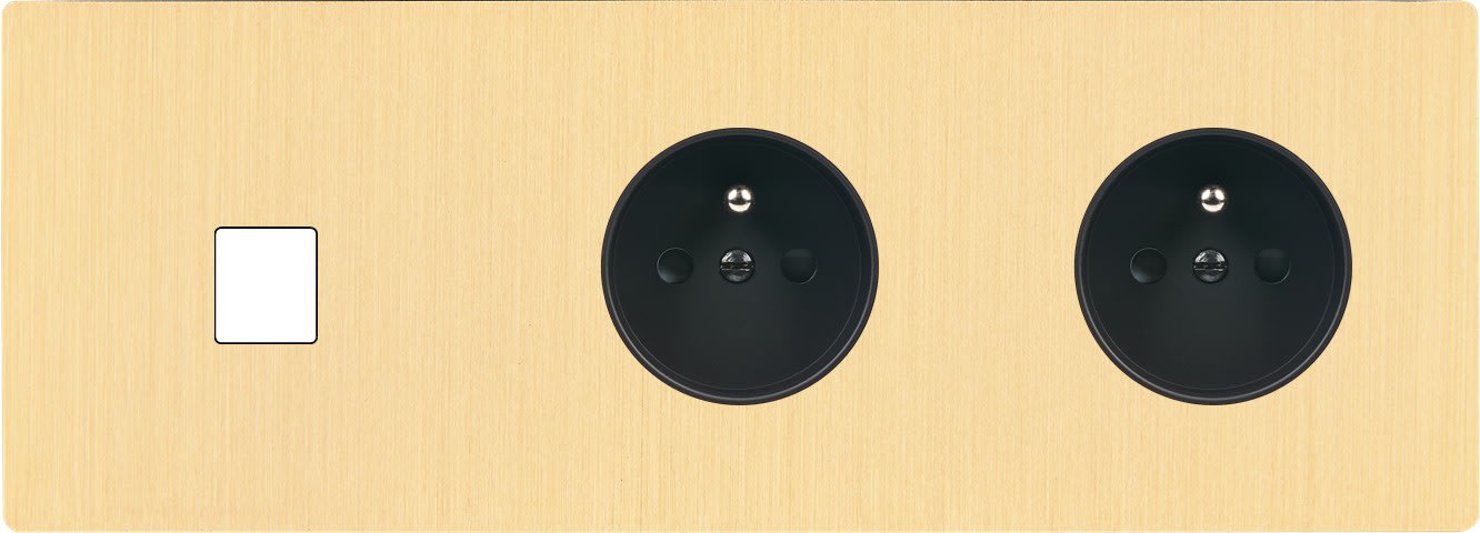 Façade "M" en laiton brossé triple horizontale, 1 Media / 1 prise de courant 2P+T /1 prise 2P+T. Façade magnétique. Fabriquée en France.