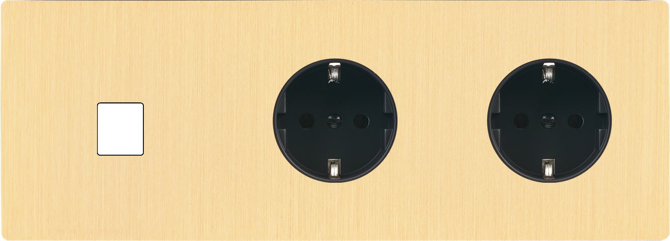 Façade "M" en laiton brossé triple horizontale, 1 Media / 1 prise Schuko / 1 prise schuko. Façade magnétique. Fabriquée en France.
