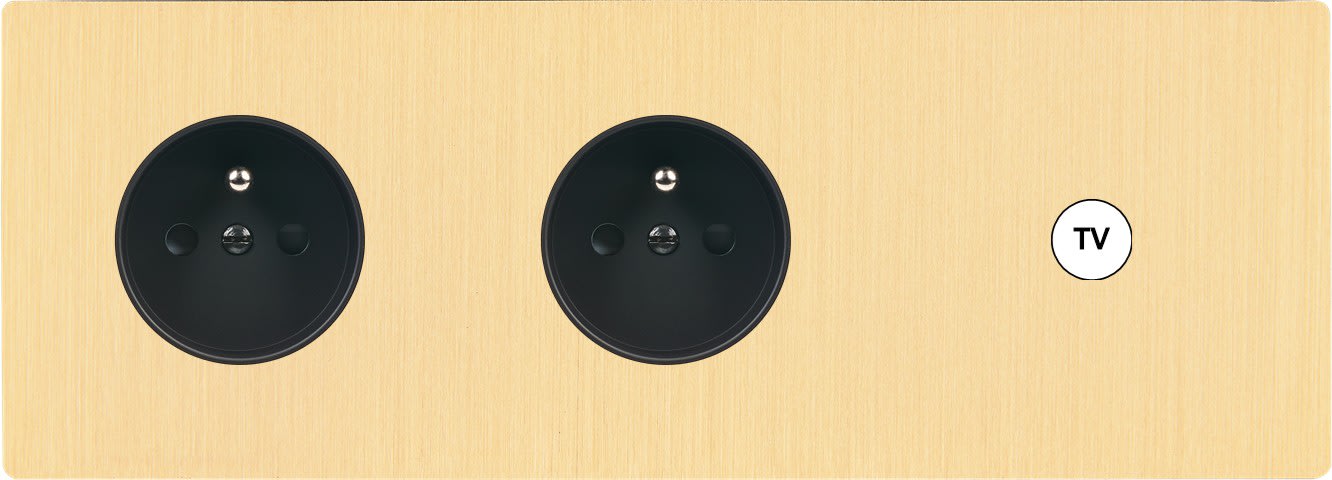 Façade "M" en laiton brossé triple horizontale, 1 prise de courant 2P+T / 1 prise de courant 2P+T / 1 prise tv. Façade magnétique. Fabriquée en France.