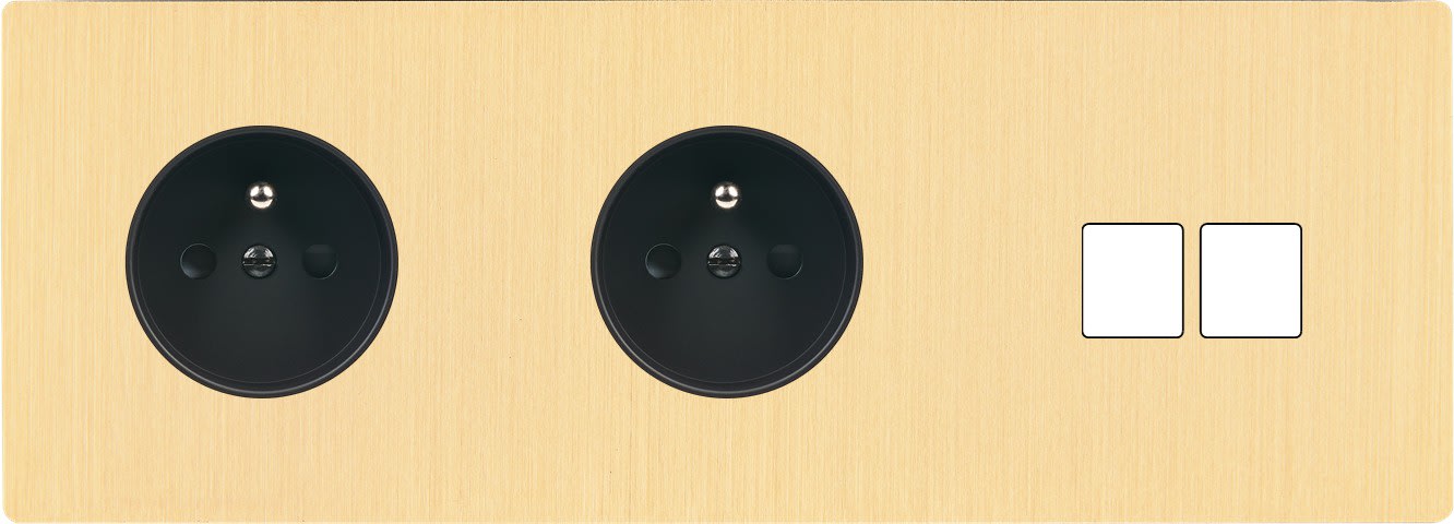 Façade "M" en laiton brossé triple horizontale, 1 prise de courant 2P+T /1 prise de courant 2P+T /2 media. Façade magnétique. Fabriquée en France.