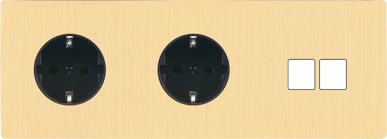Façade "M" en laiton brossé triple horizontale, 1 prise Schuko / 1 prise schuko 2 media. Façade magnétique. Fabriquée en France.