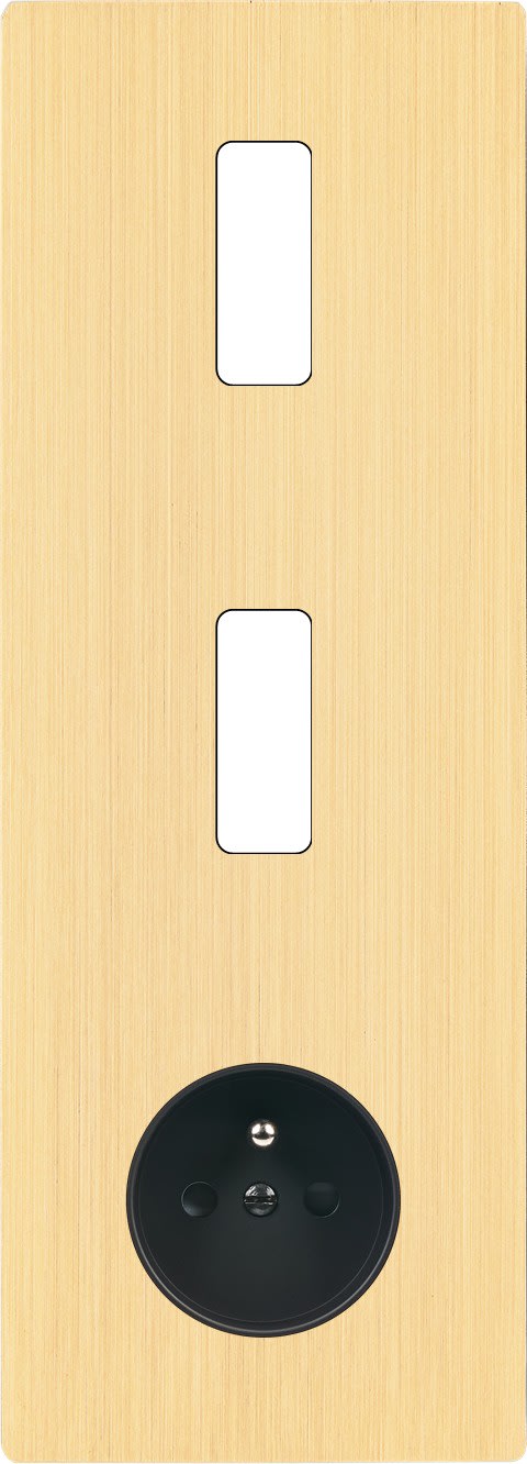 Façade "M" en laiton brossé triple verticale, 1 bouton / 1 bouton / 1 prise 2P+T. Façade magnétique. Fabriquée en France.