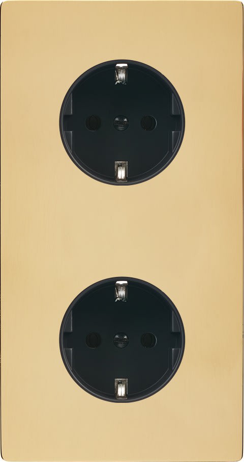 Façade "M" Laiton Miroir double verticale, 1 prise Schuko / 1 prise schuko. Façade magnétique. Fabriquée en France. Sur cette finition, le laiton n'est pas verni, pour qu'il se patine avec le temps.