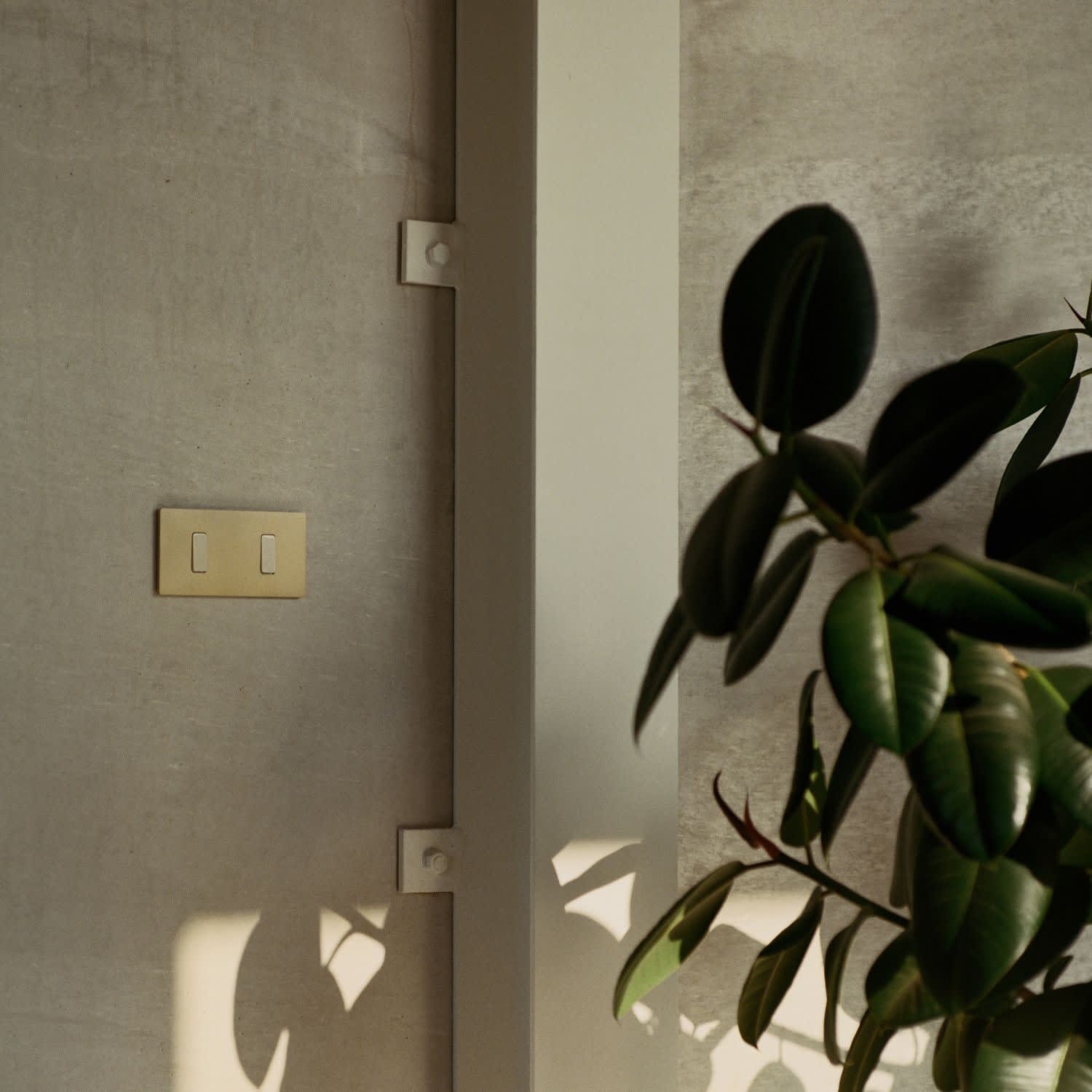 Façade "M" en Laiton Sablé triple verticale, 1 bouton / 1 prise Schuko / 1 prise schuko. Façade magnétique. Fabriquée en France.