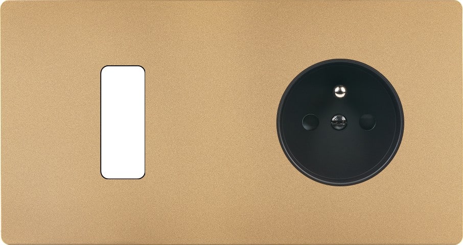 Façade "M" en Laiton Sablé double horizontale, 1 bouton / 1 prise de courant 2P+T. Façade magnétique. Fabriquée en France.