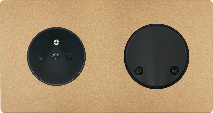 Façade "M" en Laiton Sablé double horizontale, 1 prise 2P+T / 1 sortie de câble. Façade magnétique. Fabriquée en France.