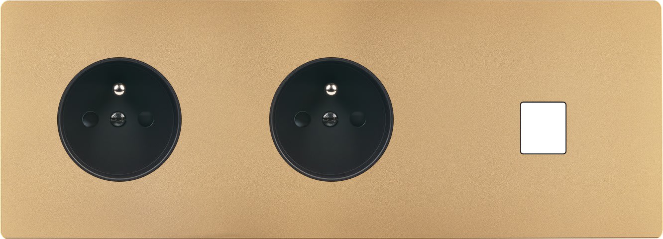 Façade "M" en Laiton Sablé triple horizontale, 1 prise de courant 2P+T /1 prise de courant 2P+T /1 media. Façade magnétique. Fabriquée en France.