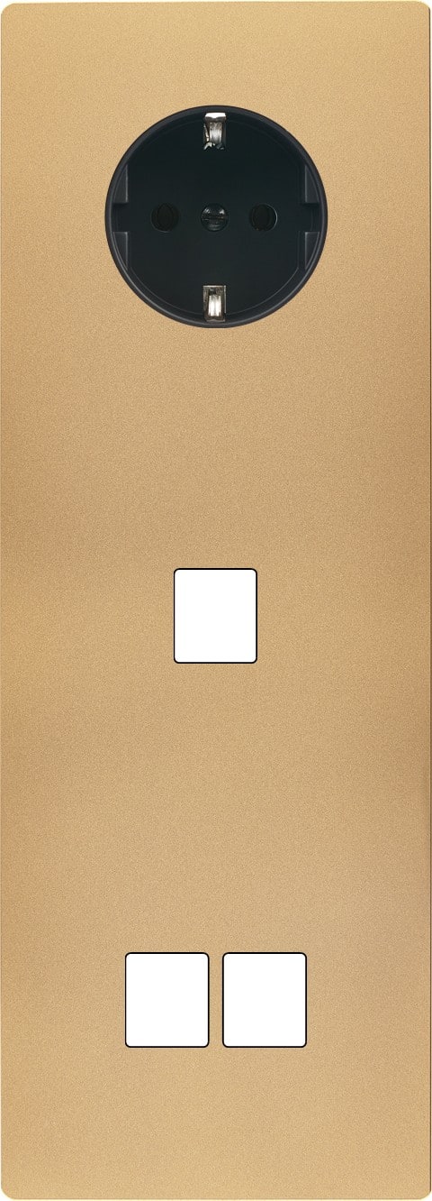 Façade "M" en Laiton Sablé triple verticale, 1 prise Schuko / 1 Media / 2 media. Façade magnétique. Fabriquée en France.
