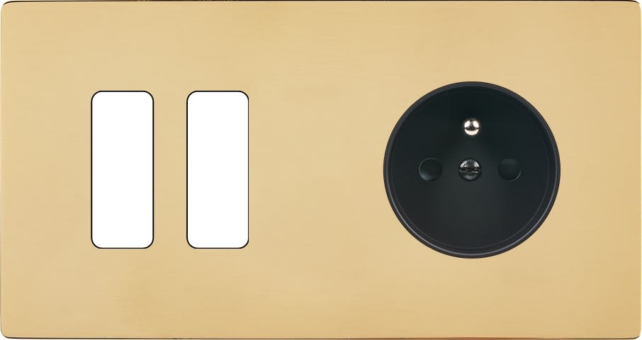 Façade "M" Laiton Verni double horizontale, 2 boutons / 1 prise de courant 2P+T. Façade magnétique. Fabriquée en France.