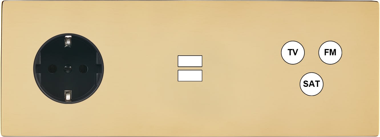 Façade "M" Laiton Verni triple horizontale, 1 prise Schuko / 1 chargeur USB / 1 tv-fm-sat. Façade magnétique. Fabriquée en France.
