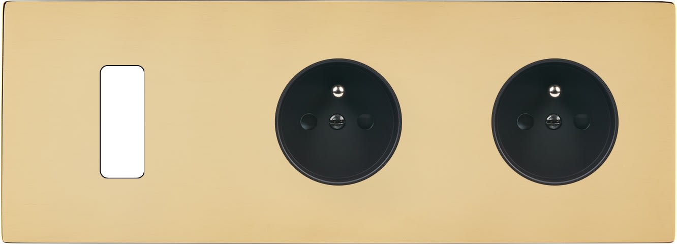Façade "M" Laiton Verni triple horizontale, 1 bouton 1 prise de courant 2P+T /1 prise de courant 2P+T. Façade magnétique. Fabriquée en France.