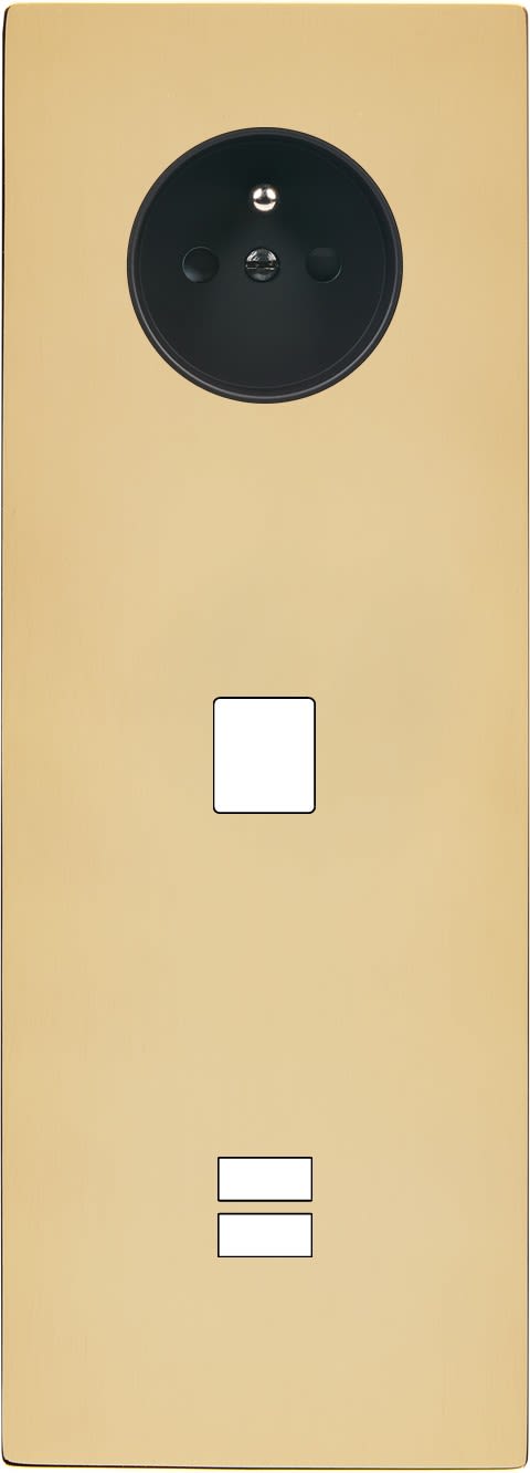 Façade "M" Laiton Verni triple verticale, 1 prise 2P+T / 1 Media / 1 chargeur USB. Façade magnétique. Fabriquée en France.
