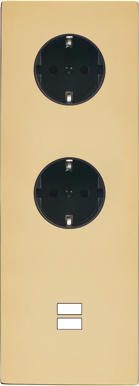Façade "M" Laiton Verni triple verticale, 1 prise schuko / 1 prise schuko / 1 chargeur USB. Façade magnétique. Fabriquée en France.