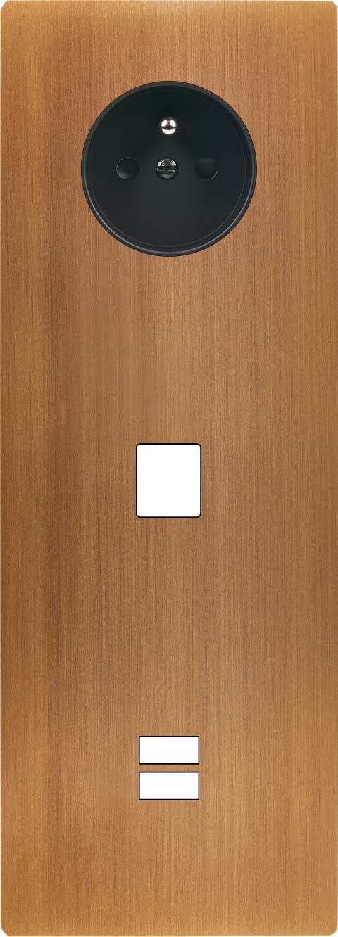Façade "M" en laiton massif finition Vieux Bronze Triple verticale, 1 prise 2P+T / 1 Media / 1 Chargeur USB. Façade magnétique. Fabriquée en France.