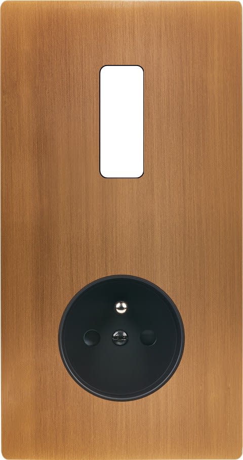 Façade "M" en laiton massif finition Vieux Bronze double verticale, 1 bouton / 1 prise 2P+T. Façade magnétique. Fabriquée en France.