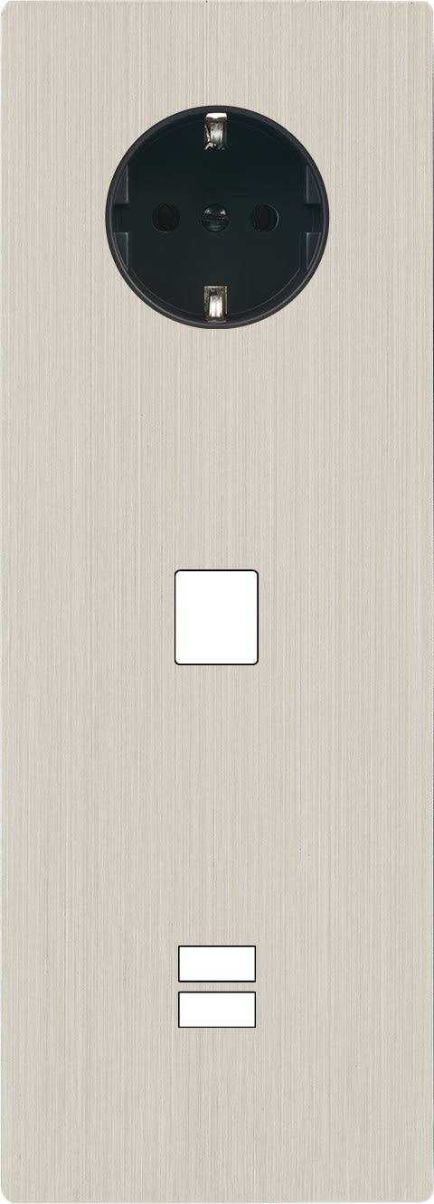 Façade "M" en laiton massif finition Nickel Brossé, triple verticale, 1 prise Schuko / 1 Media / 1 chargeur USB. Façade magnétique. Fabriquée en France.