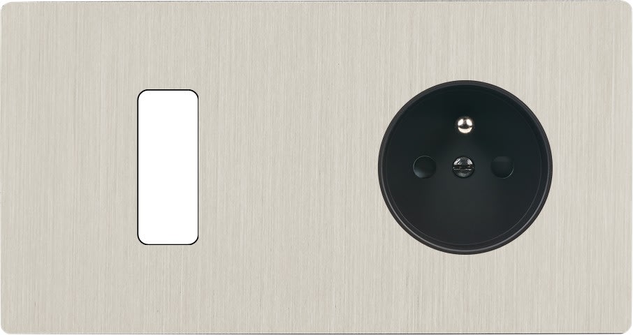 Façade "M" en laiton massif finition Nickel Brossé, double horizontale, 1 bouton 1 prise de courant 2P+T. Façade magnétique. Fabriquée en France.