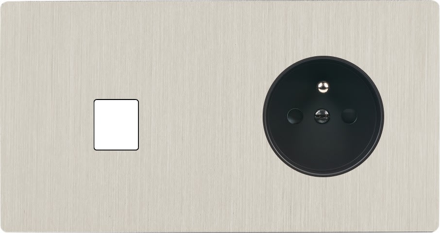 Façade "M" en laiton massif finition Nickel Brossé, double horizontale, 1 Media / 1 prise de courant 2P+T. Façade magnétique. Fabriquée en France.