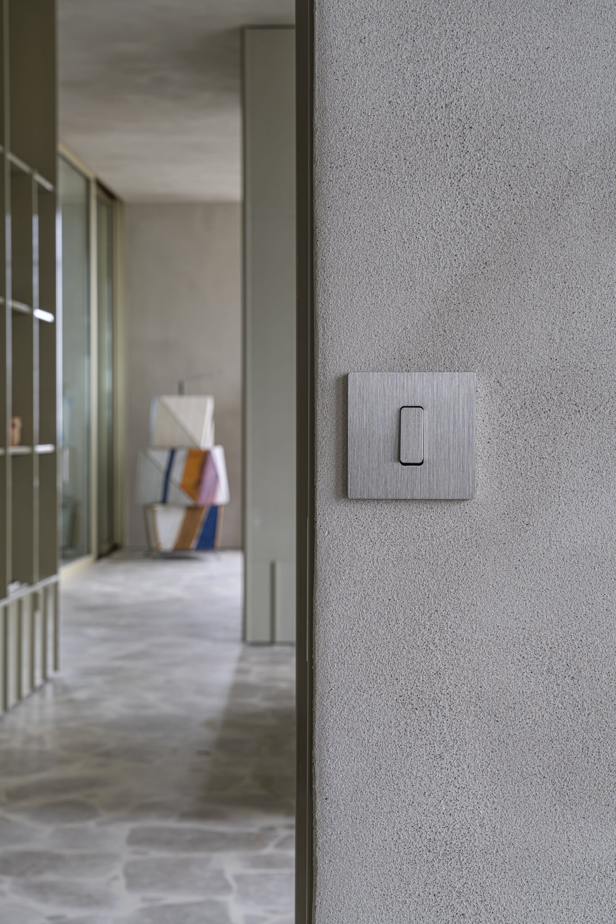 Façade d'interrupteur à bouton plat collection M - En laiton épaisseur 5mm - Dimensions 80x80mm - 13 finitions disponibles - Fabriqué en France - Montage sur boîtiers standards profondeur 50mm - Façade magnétique