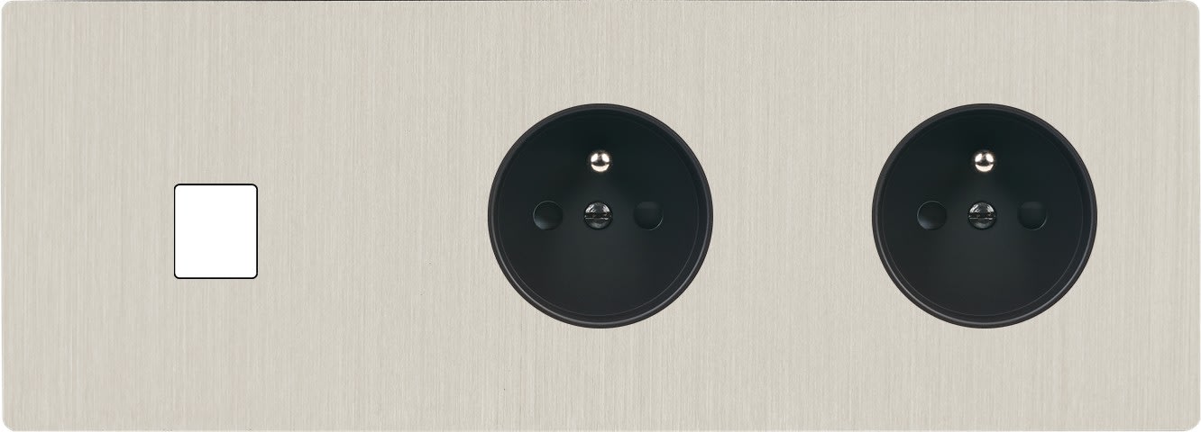 Façade "M" en laiton massif finition Nickel Brossé, triple horizontale, 1 Media / 1 prise de courant 2P+T /1 prise 2P+T. Façade magnétique. Fabriquée en France.