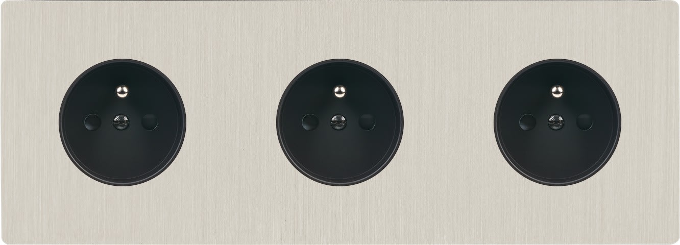 Façade "M" en laiton massif finition Nickel Brossé, triple horizontale, 1 prise de courant 2P+T /1 prise 1 prise 2P+T. Façade magnétique. Fabriquée en France.