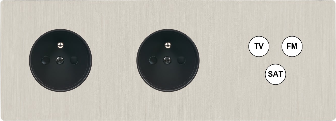 Façade "M" en laiton massif finition Nickel Brossé, triple horizontale, 1 prise de courant 2P+T /1 prise 1 tv-fm-sat. Façade magnétique. Fabriquée en France.