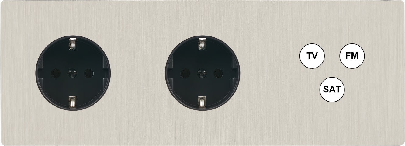 Façade "M" en laiton massif finition Nickel Brossé, triple horizontale, 1 prise Schuko / 1 prise Schuko / 1 tv-fm-sat. Façade magnétique. Fabriquée en France.