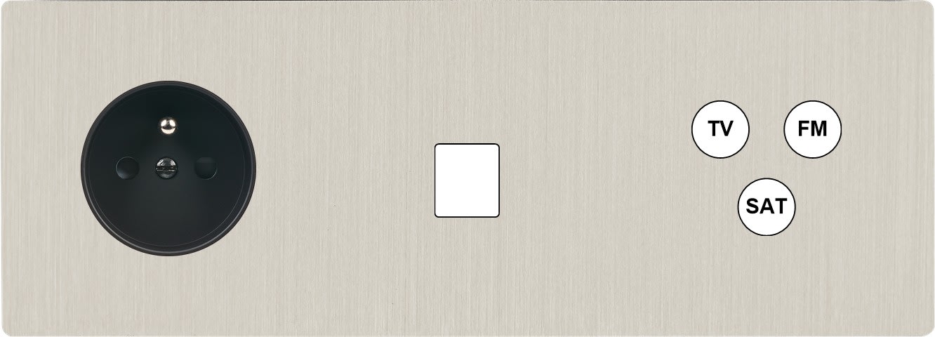 Façade "M" en laiton massif finition Nickel Brossé, triple horizontale, prise de courant 2P+T / 1 media / 1 tv-fm-sat. Façade magnétique. Fabriquée en France.