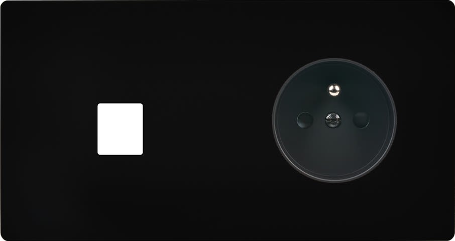 Façade "M" en aluminium finition Noir Mat double horizontale, 1 Media / 1 prise de courant 2P+T. Façade magnétique. Fabriquée en France.