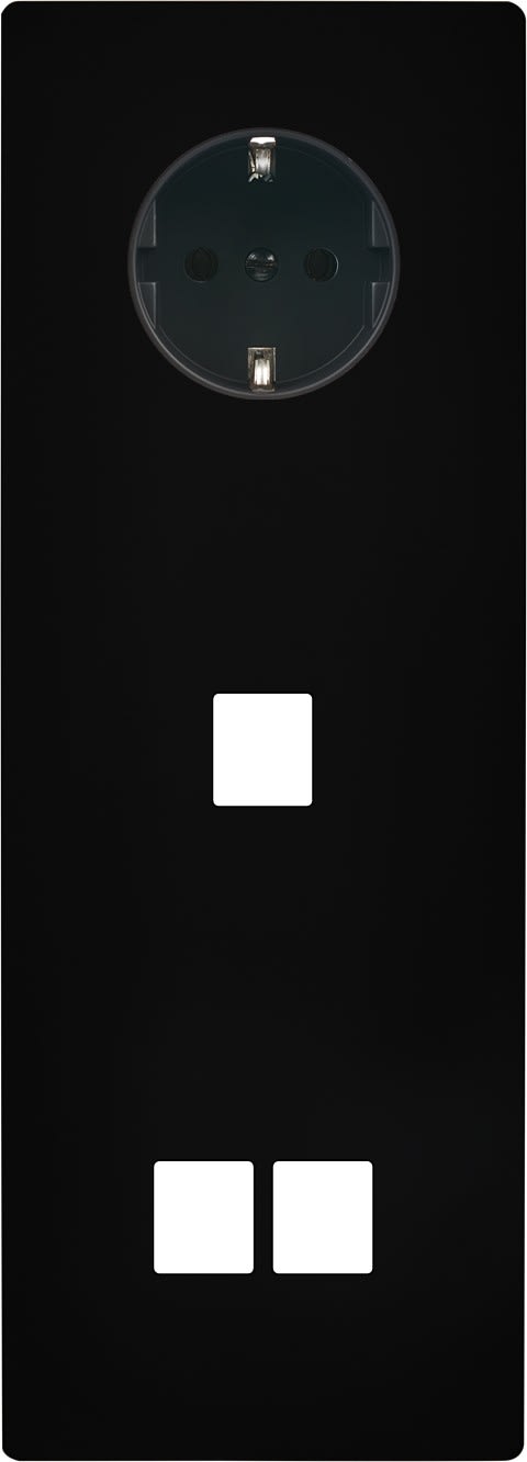 Façade "M" en aluminium finition Noir Mat triple verticale, 1 prise Schuko / 1 Media / 2 media. Façade magnétique. Fabriquée en France.
