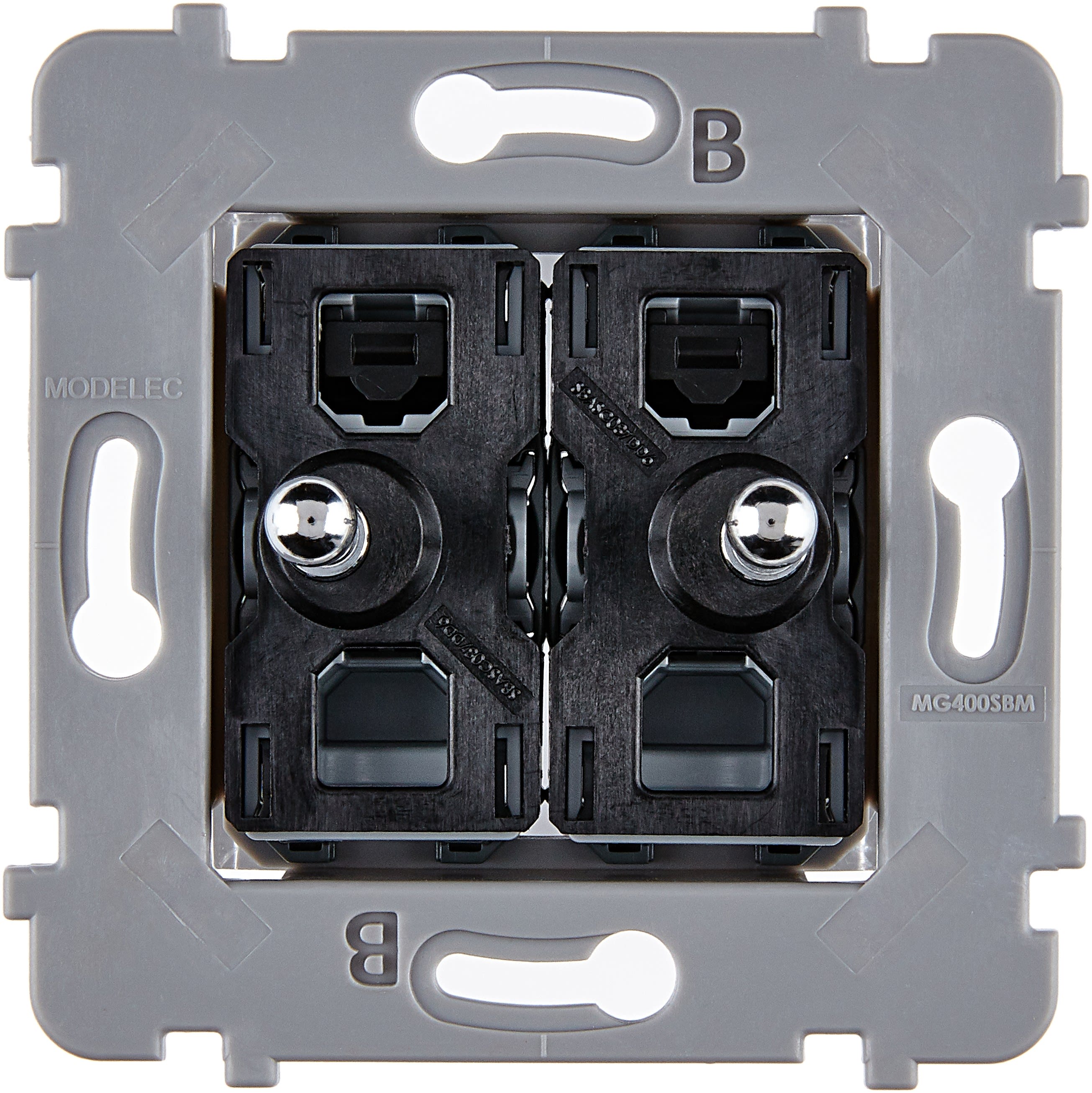 Mécanismes standards pour interrupteurs MODELEC:- Compatibles avec toutes nos collections - Mécanismes silencieux- Installation facile et rapide grâce à la connexion automatique- Conformes à la norme d’installation sans raccordement à la terre (sauf prise 2P+T)- Fonctions disponibles: DUO (va et vient ou poussoir), volets roulants (va-et-vient ou poussoir), prises (2P+T, Schuko, HDMI, TV, USB, RJ45, etc.), obturateurs, détecteurs de présence, interrupteur à carte, sortie de câble, etc.