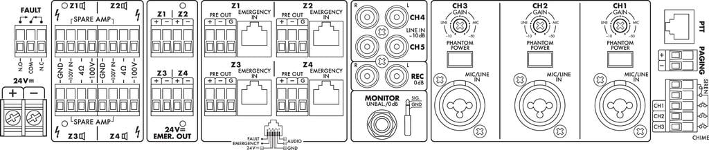 Avec le micro PA-4000RC, en option, l'amplificateur peut être intégré dans une installation 4 canaux. Combiné à un module de messages mémorisés intégré, il peut composer par exemple une centrale d'alarme pour écoles.
