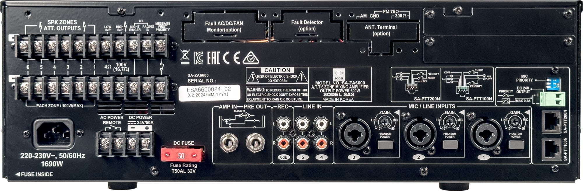 Amplificateur Public Adress, 600 W, 100 V, 4 ?, 6 zones, Alimentation 230 V~ / 24 V=