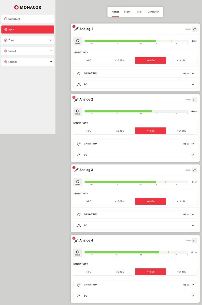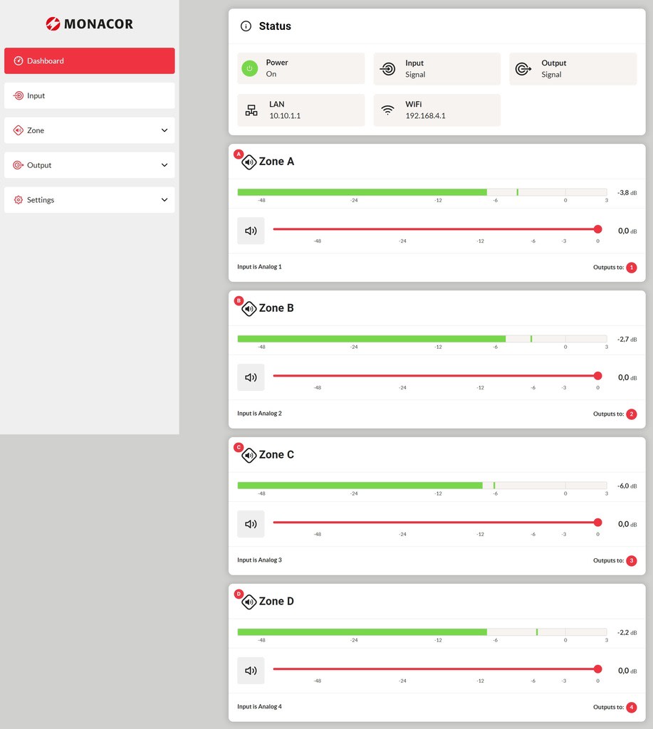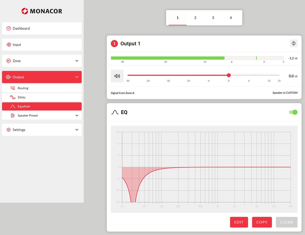 Monacor - Amplificateur Public Adress classe D, 4 x 125W (4/8?) ou 2 x 250W (100V), DSP - PA-4125DX