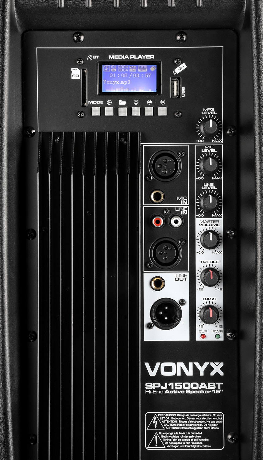 Une enceinte 15“, ABS avec amplificateur mixeur 800 W, technologie BT, lecteur MP3, grave médium puissant et tweeter dynamique à compression pour une excellente reproduction sonore. Flexibilité illimitée dans le positionnement grâce à la technologie BT. Le lecteur MP3 lit la musique depuis une clé USB ou une carte SD. La sortie ligne permet un branchement successif d'enceintes supplémentaires. La caisse ABS résistante dispose d'une grille métallique pour protéger le grave. Cette enceinte active peut être utilisée seule et est idéale pour des bars, restaurants, centres de fitness, de conférence, théâtres, halls d'exposition, sur scène..