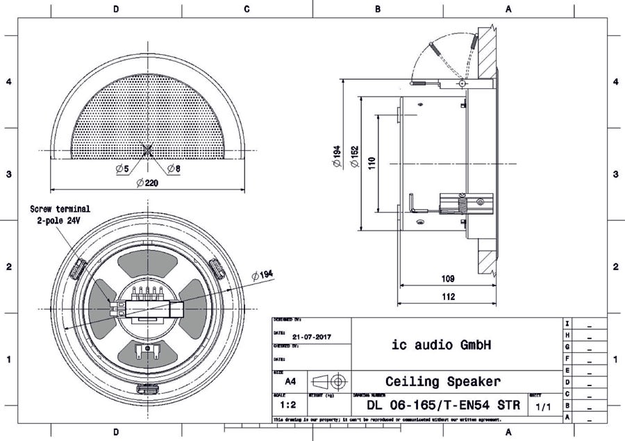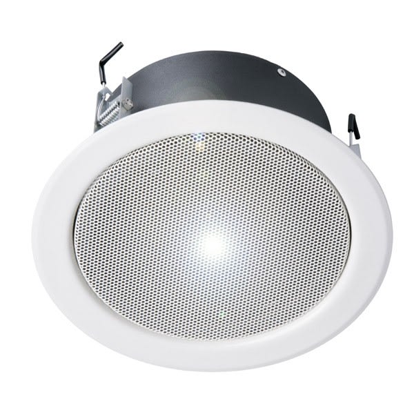Haut-parleur de plafond avec dôme métallique anti-feu pour les applications d'alarme vocale certifié EN 54-24, adapté aux annonces vocales et à la musique d'ambiance avec une excellente qualité sonore.Haut-parleur de 6 W large bande de 165 mm équipé d'un transformateur de 100 V avec 3 réglages de puissance. En outre, le haut-parleur est équipé d'un stroboscope à LED 14 candela / 1 400 lux à une distance de 100 mm et une fréquence de clignotement de 75 flashs par minute. Avec 18 lumens de lumière et un large angle de rayonnement (75°), la LED stroboscopique permet d'éclairer des zones de manière claire et uniforme. La tension de fonctionnement de la LED stroboscopique est de 24 VDC, la consommation de courant est de 9 mA au maximum.Un bloc céramique à 2 broches et un fusible thermique assurent une fiabilité supplémentaire. La membrane du haut-parleur est imprégnée contre l'humidité.Le haut-parleur offre un degré de protection IP 21C contre les risques liés aux influences environnementales. Montage rapide et facile avec des pinces à ressort.Le haut-parleur est conforme à la norme britannique BS 5839, partie 8.Ce haut-parleur convient pour un plafond d'une épaisseur d'environ 2 à 45 mm.