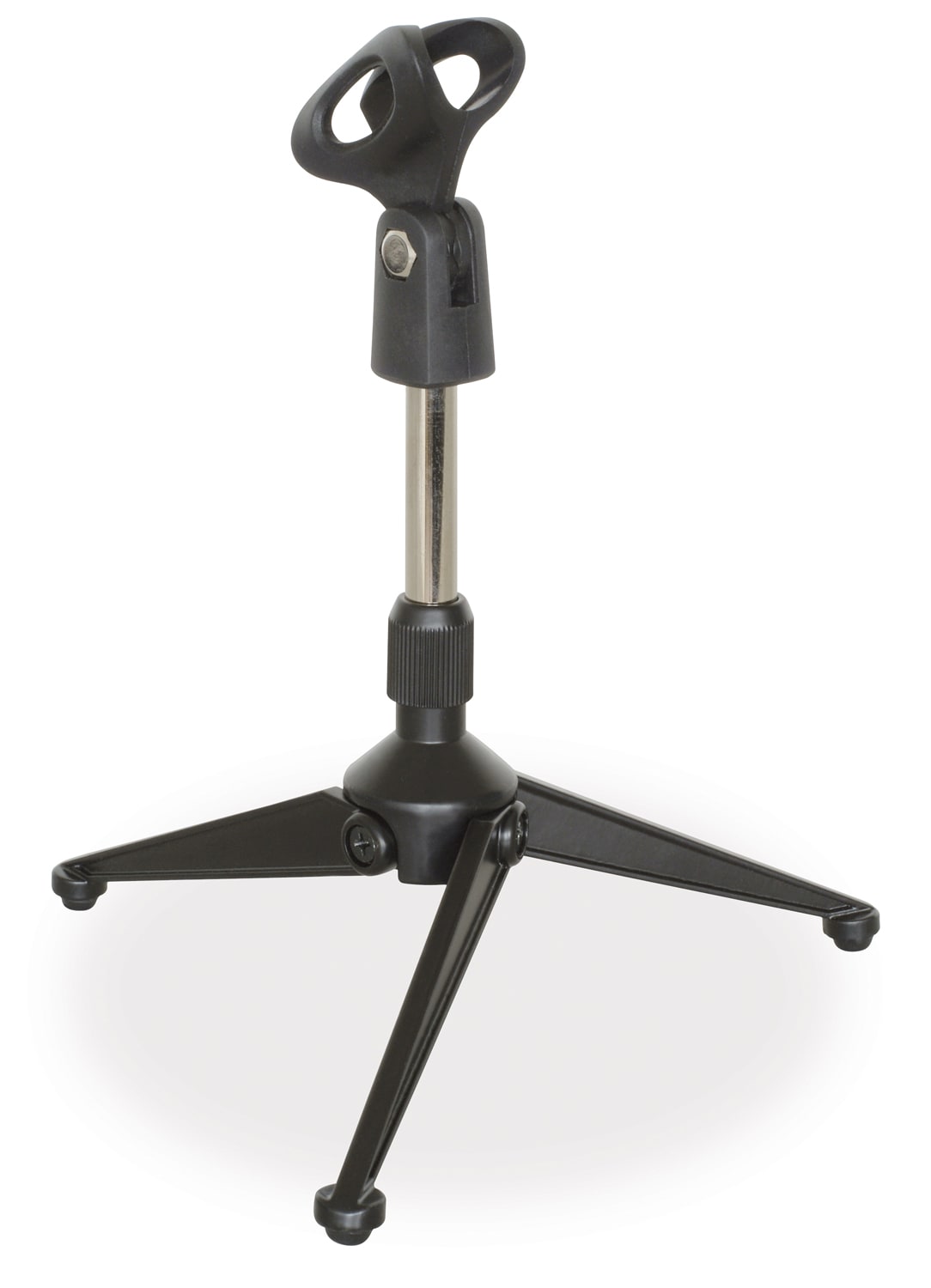 Un pied de micro solide, 3 pieds repliables, pour lecteurs et instruments devant être placés près du sol. La hauteur est réglable. Pince micro plastique avec adaptateur filetage 3/8“ et 5/8“. Pied compatible pour la majorité des micros.