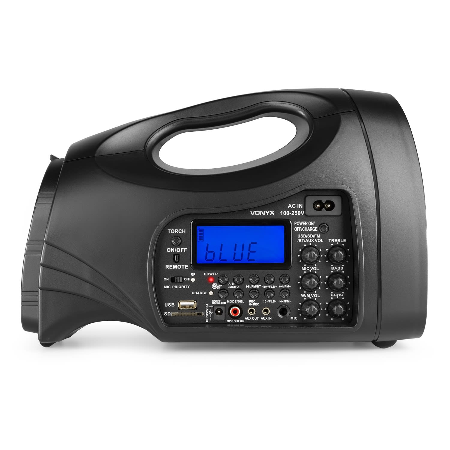 Le ST016 est un système amplifié portable, léger et compact, équipé d'un système de microphone sans fil UHF, composé d'un casque et d'un microphone à main. L’enceinte est dotée d'un accumulateur Li-ion haute capacité intégré elle est ainsi parfait pour des activités de plein air où il n'y a pas d'accès à une prise murale. En outre, le ST016 est doté d'autres fonctions : un lecteur de musique intégré complet avec port USB, un lecteur de carte SD, un tuner FM et une fonction streaming BT 5.0. (jusqu'à 20 mètres de portée). Le grand écran LCD et la fonction de torche complètent cet appareil. Ce système est parfait pour des applications en intérieur et en extérieur, par exemple enseignement, fitness, conférences, promotion des ventes, visites guidées, etc., partout où vous avez besoin d’amplifier la voix.