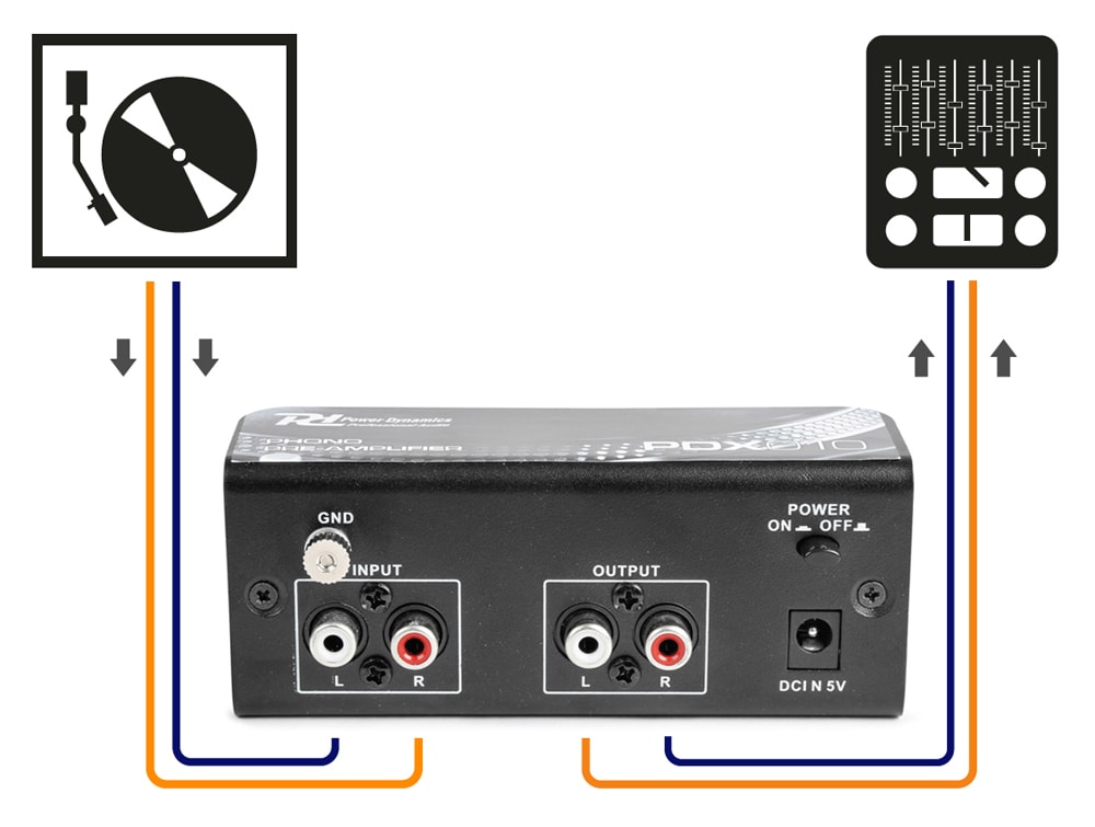 Le PDX010 est un préamplificateur phono, idéal pour les amplificateurs sans entrée phono. Ce préamplificateur avec correction RIAA amplifie le signal faible de votre appareil en un signal ligne normal, le son en est grandement amélioré. Avec ce préamplificateur, vous pouvez brancher vos vieux appareils sur votre table de mixage moderne.