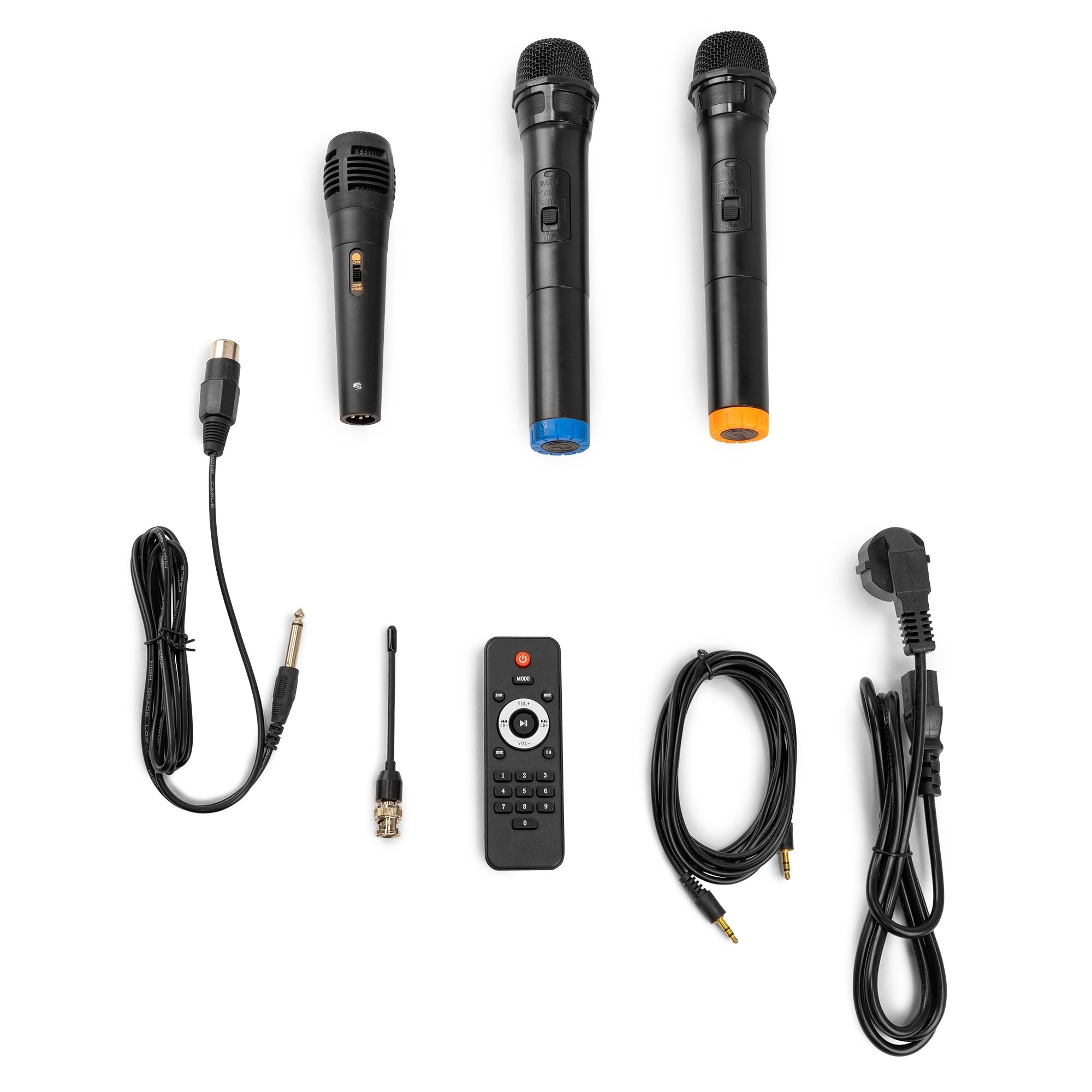 Un système de sono portable 12" professionnel CD/MP3 avec récepteur BT pour streaming audio. Ce système de sono portable avec amplificateur 450 W intégré et double accumulateur est idéal pour des karaokés. Il est livré avec deux microphones UHF main et une télécommande. Grâce aux roulettes et poignée télescopique, il peut être facilement déplacé et utilisé même sans alimentation secteur. Il est parfait pour des écoles, campings, groupes de danse, karaokés...