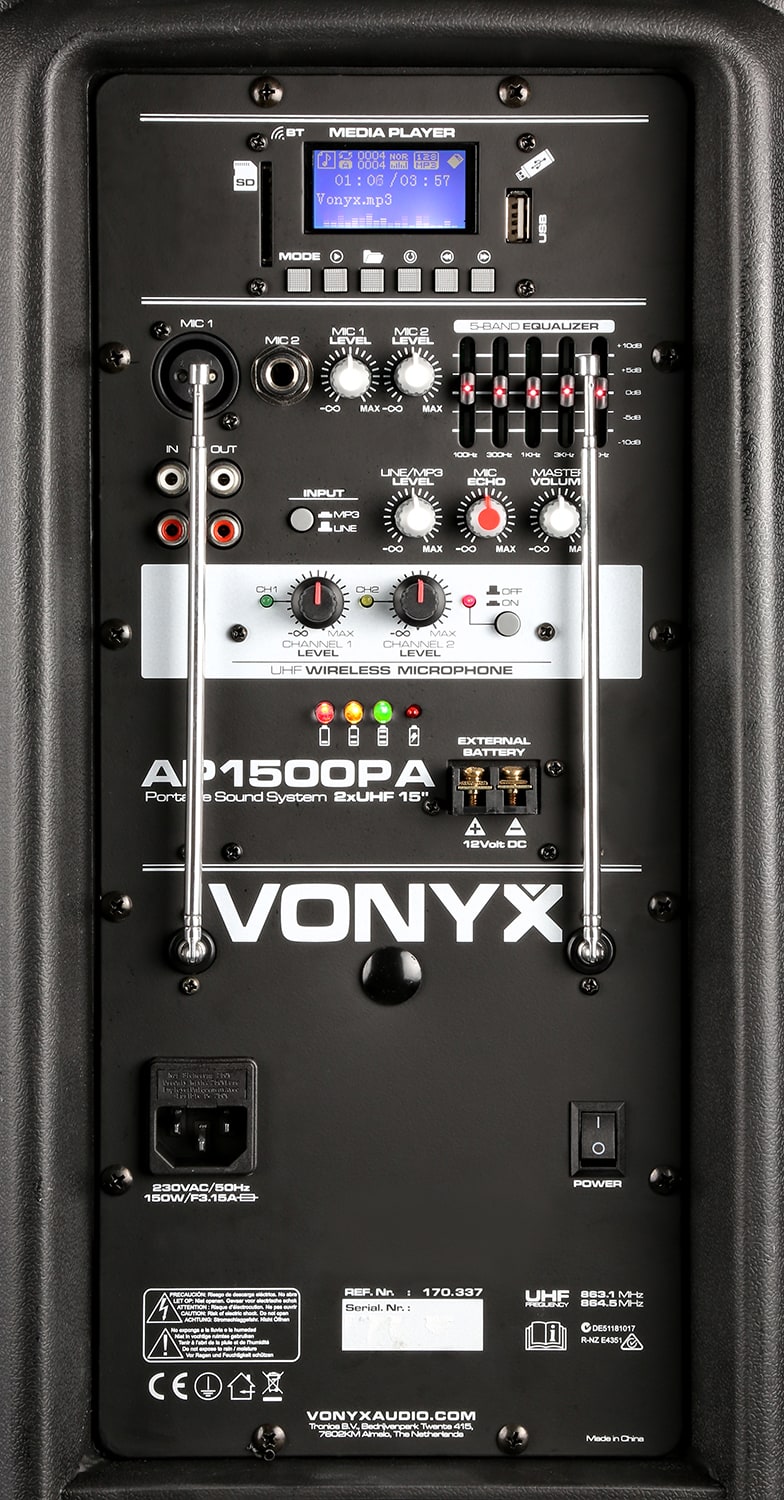 Sono portable sur batterie, 15" BT/MP3/USB, 2 micro main UHF - AP1500PA