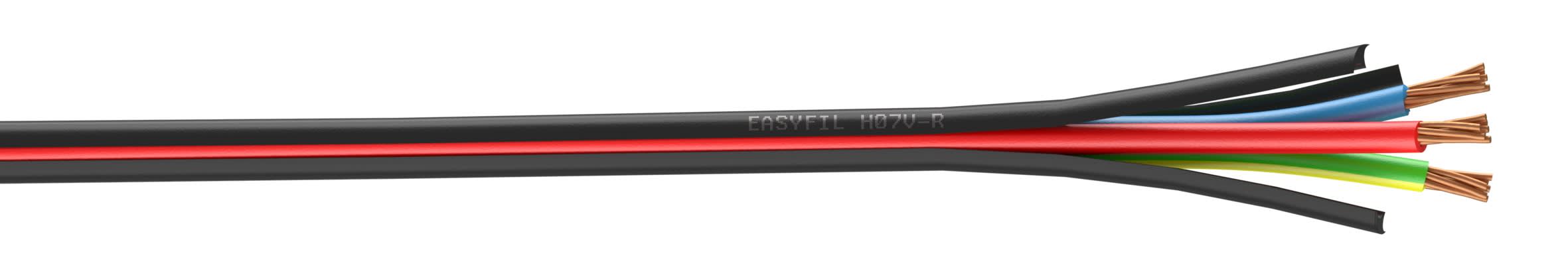 Les 3 Fils Nexans HO7V-R Easyfil pour les sections 6 mm² sont préassemblés grâce à un liant pelable. Easyfil est idéal pour les passages dans les goulottes ou dans les plinthes et permet de gagner 50% du temps car il n’y a qu’un seul et unique élément à tirer, donc le risque d’emmêler les fils disparaît.