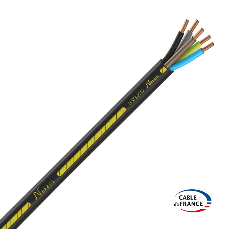 Le câble DISTINGO U-1000 R2V Nexans est destiné pour des installations tertiaires ou industrielles pouvant résister à des conditions sévères.Le câble U-1000 R2V Distingo pour les sections du 1.5mm² à 16mm² et de 2 à 5 conducteurs, a été conçu pour faciliter le travail des installateurs. Distingo intègre trois améliorations majeures : un marquage métrique pour connaître la longueur restante, un repérage de la section grâce au couleur et enfin une indication du nombre de conducteurs.
