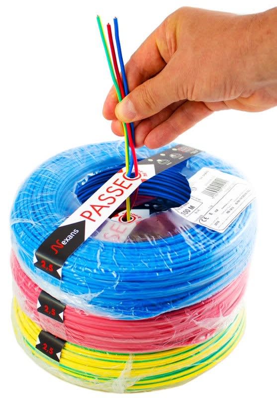 Les Fils Passeo HO7V-U Nexans pour les sections 1.5, 2.5 mm² ont été conçus pour faciliter le travail au quotidien des installateurs. Grâce à son packaging astucieux doté d'une poignée , le transport est facilité. Le guide fil améliore le tirage en supprimant l’effet « queue de cochon ». Son packaging permet également d’empiler jusqu’à 5 couronnes tout en repérant la section grâce à sa bande adhésive. Les fils Passeo sont fabriqués en France, dans l’usine Nexans d’Autun, ce qui garantit une qualité premium.