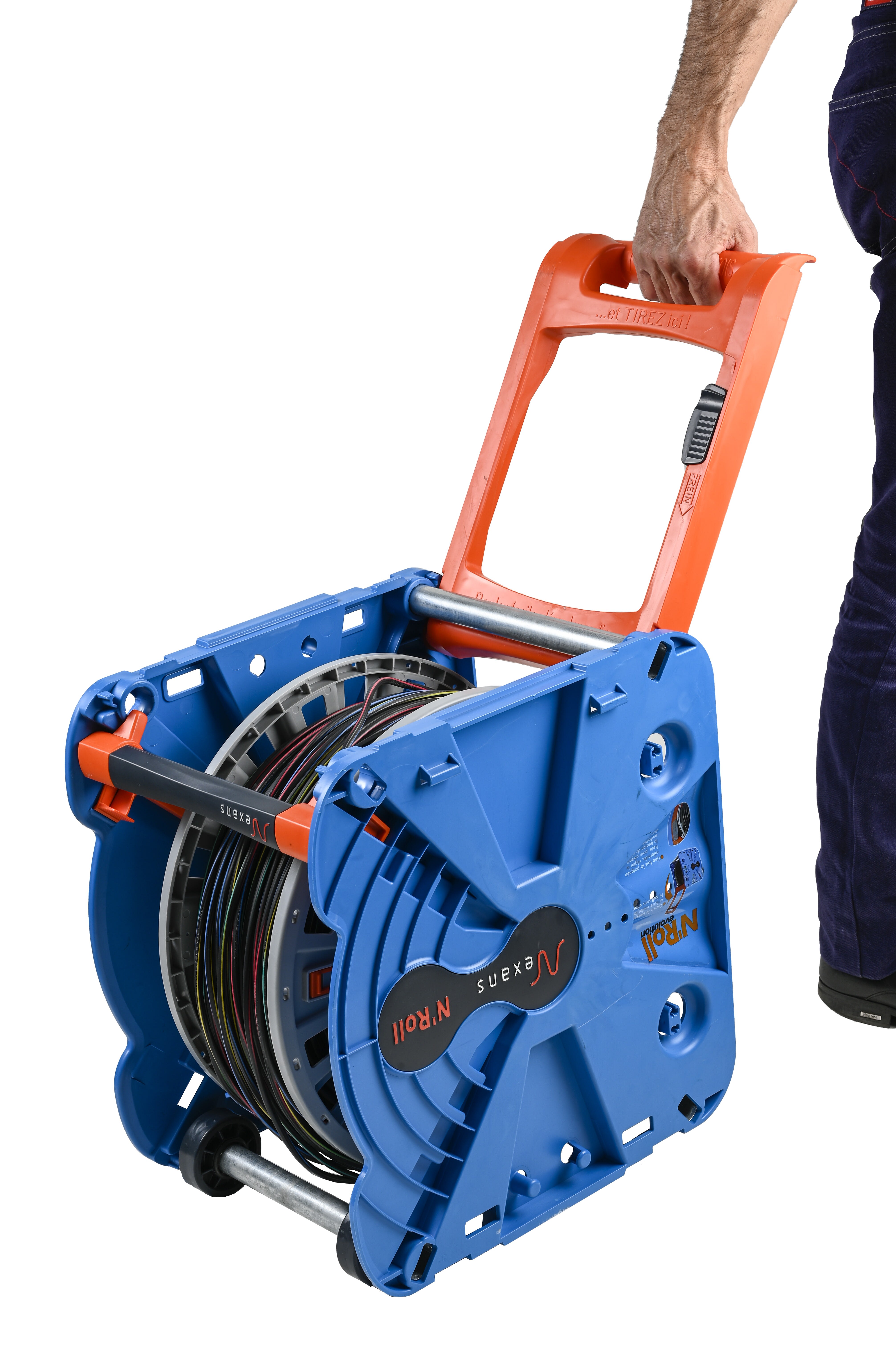 Nexans dérouleur couronne N'Roll , permet de gagner du temps sur les chantier pour dérouler plus rapidement des cables. Ce dérouleur comporte une poignée rétractable, un frein réglable et des roulettes pour dérouler facilement les câbles sur chantier. Il résiste à une charge jusqu'à 40 kg.