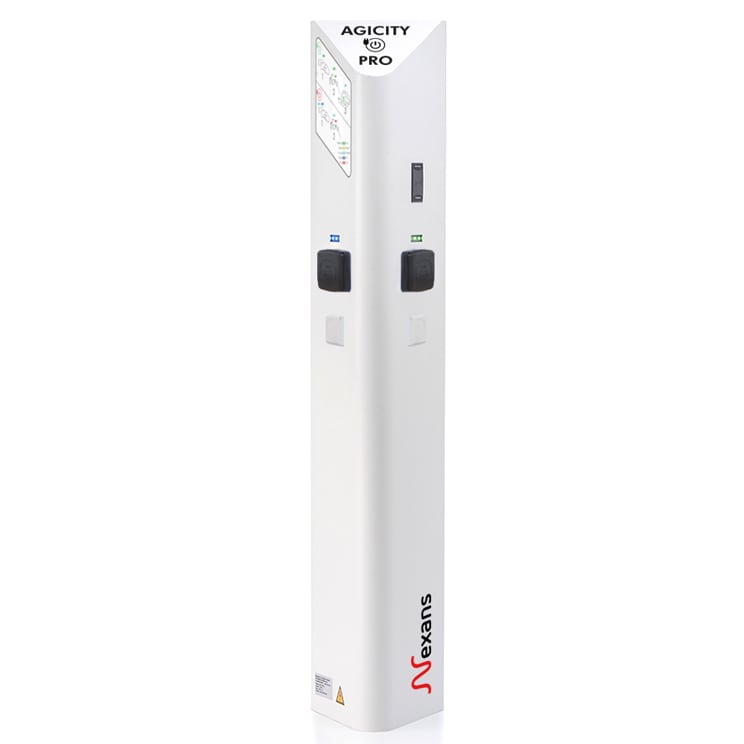 AGICITY PRO, borne de recharge robuste pour espaces publics, parkings intérieurs ou extérieurs, y compris voirie. Prises T2S, accès RFID, 1 port Ethernet. Gestion d'énergie via option maître. Protections électriques.