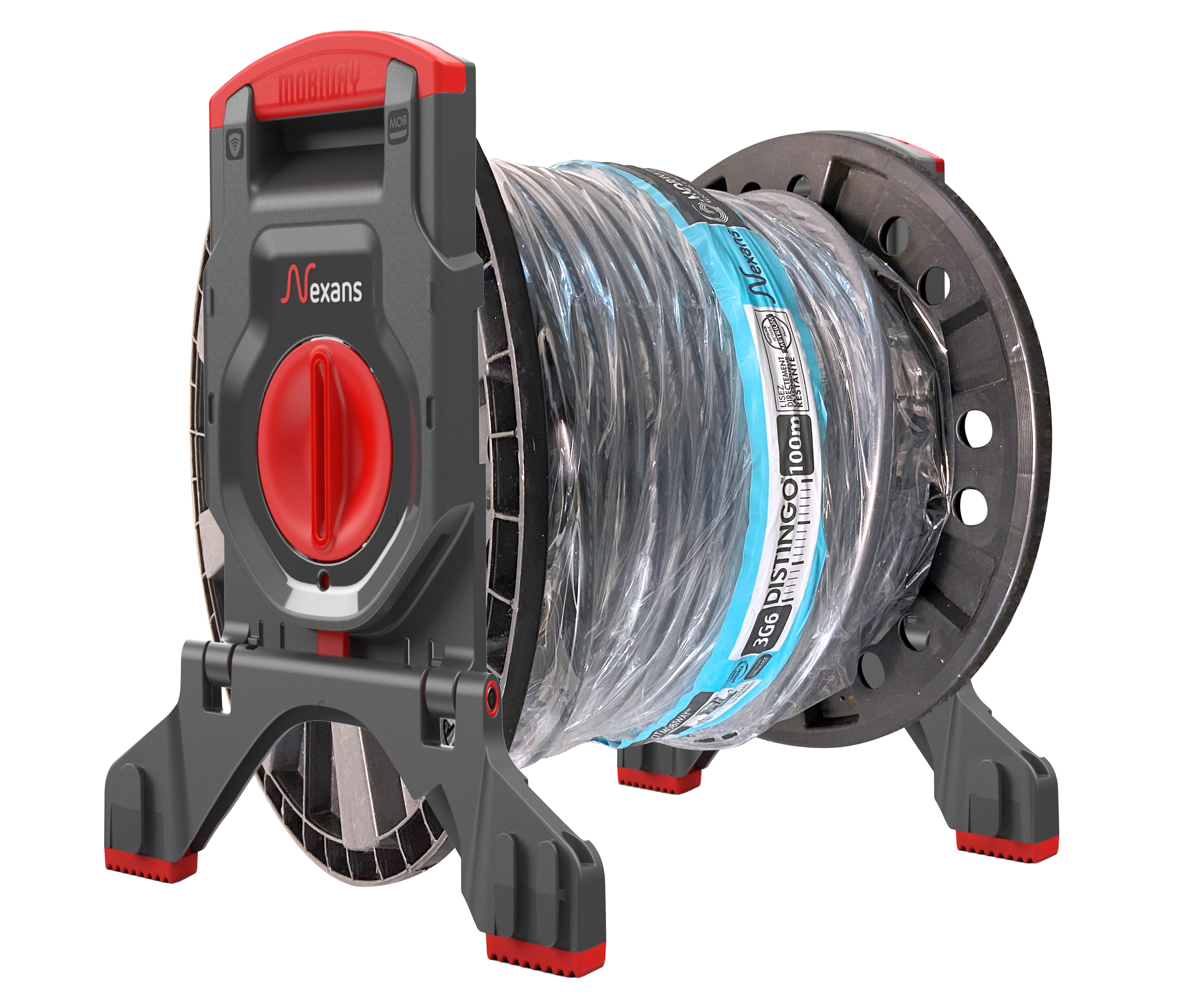 Le touret Mobiway Nexans facilite le transport grâce à son poids réduit et sa poignée. Il peut être associé à ses flasquse pour créer un système unique de déroulage, avec un trépied et des patins anti-glissement. Ce touret Mobiway est livré avec le câble U-1000 R2V Distingo.
