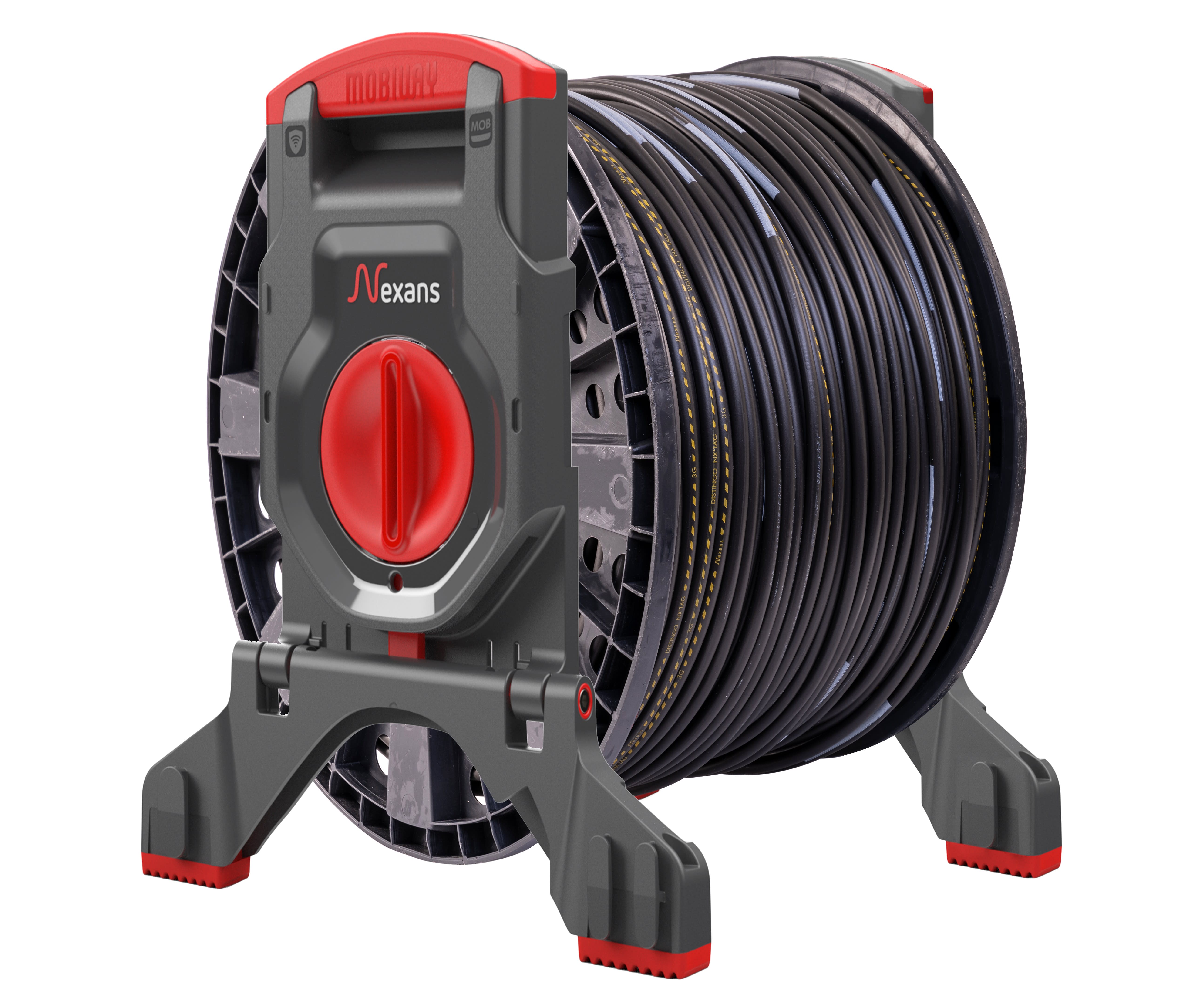 Le touret Mobiway Nexans facilite le transport grâce à son poids réduit et sa poignée. Il peut être associé à ses flasquse pour créer un système unique de déroulage, avec un trépied et des patins anti-glissement. Ce touret Mobiway est livré avec le câble U-1000 R2V Distingo.