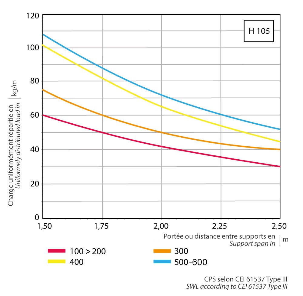 charge de travail sécurisée max. selon IEC 61537 avec dist. supports de 1,5m: